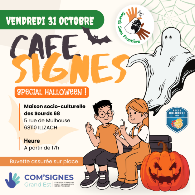 Venez nous retrouver à la Maison des Sourds 68 (Mulhouse-Illzach) le vendredi 31 octobre à partir de 17h, pour un Café-Signes spécial HALLOWEEN !