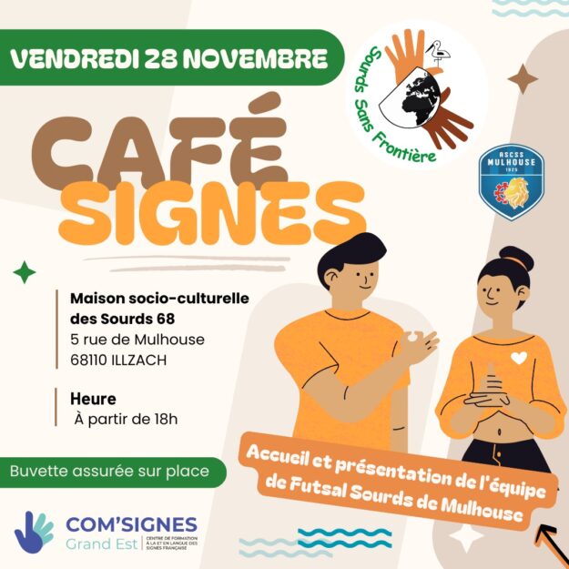 Nous avons le plaisir de vous annoncer le prochain café-signes : vendredi 28 novembre à partir de 18h à la Maison des Sourds 68 à ILLZACH. Ce sera l’occasion de vous présenter la nouvelle équipe de Futsal Sourds de Mulhouse ! Ils auront leurs premiers matchs de championnat le samedi 29/11. Venez les encourager !