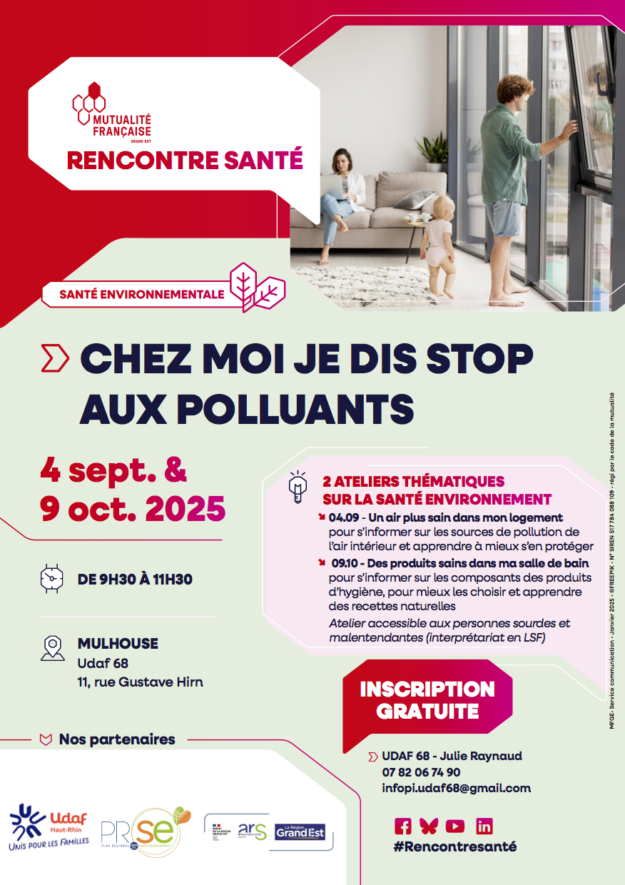 » Chez moi, je dis aux polluants » : deux nouveaux ateliers organisés par Madame Julie RAYNAUD, du service social Info’Pi, vous seront proposés au courant des mois de septembre et octobre prochains. Attention, si cela vous intéresse, il faut obligatoirement venir aux deux ateliers. Ils seront accessibles en LSF, grâce à la présence d’une interprète.…
